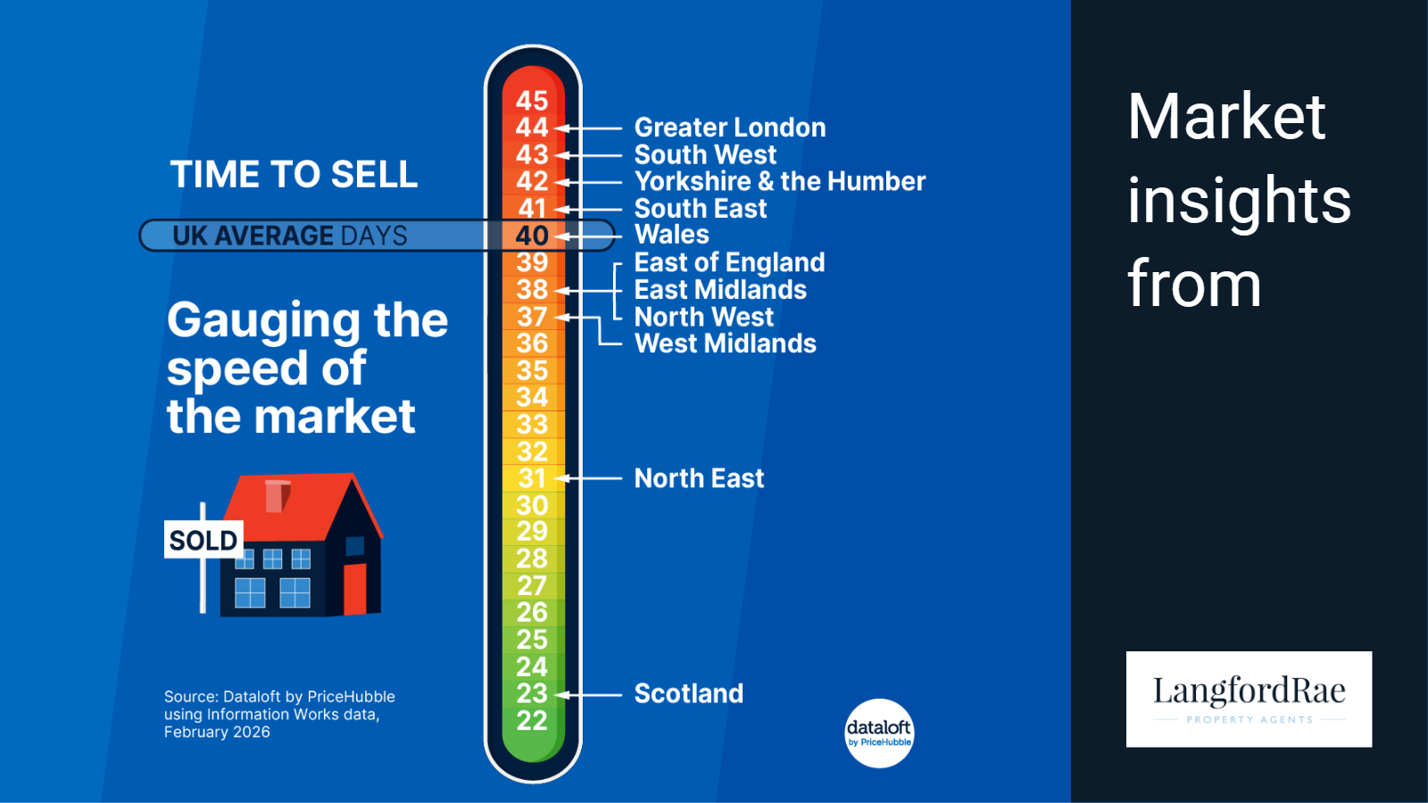 At present, the average time it takes to sell a property across England and Wales stands at around 40 days, according to data from Dataloft by PriceHubble using InformationWorks figures from February 2026. While this suggests a relatively steady pace overall, the national average hides considerable regional variation.